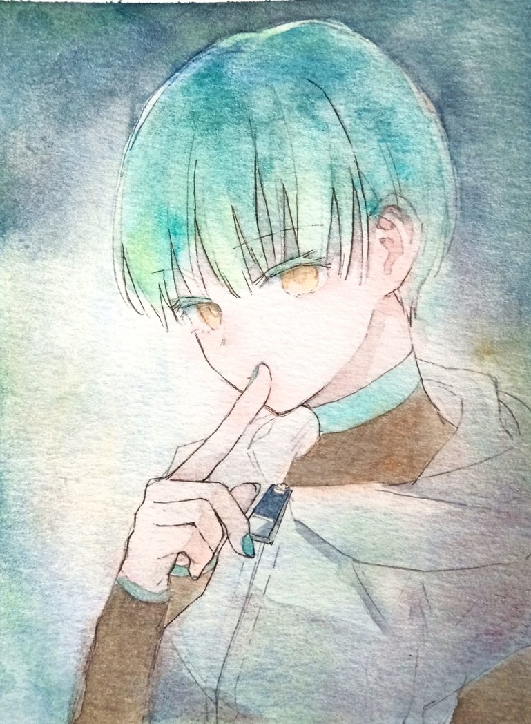それはさておきほたるくんの前髪付近とか腕あたりのような光の影響を受けて別の色になるのは水彩だと(というか成嶋にはまだ)むずかしいので、こういう部分はとくに塗っててたのしいところです。